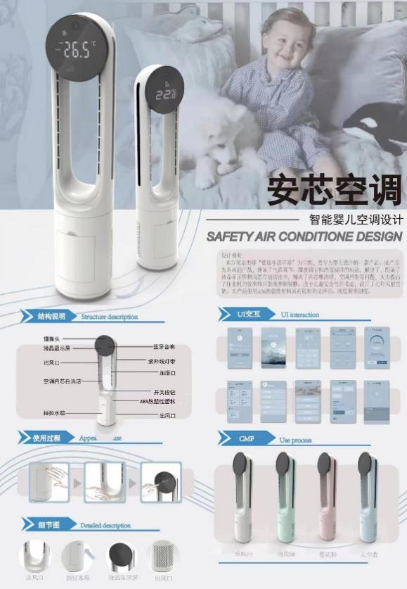 设计理念:本方案是围绕健康生活环境为主题,是专为婴儿设计的一款产品。该产品为多功能产品,兼备了气温调节、湿度调节和消毒清洁的功能,解决了,配备了液晶显示屏和内芯自清洁技术,解决了内芯难清理,空调控制等问题,大大提高了作业时的效率和后期维养和保修。出于儿童安全性的考虑,设计了无叶风扇空调。本产品使用 ABS 热塑性材料具有较好的光泽的、硬度和坚韧度。