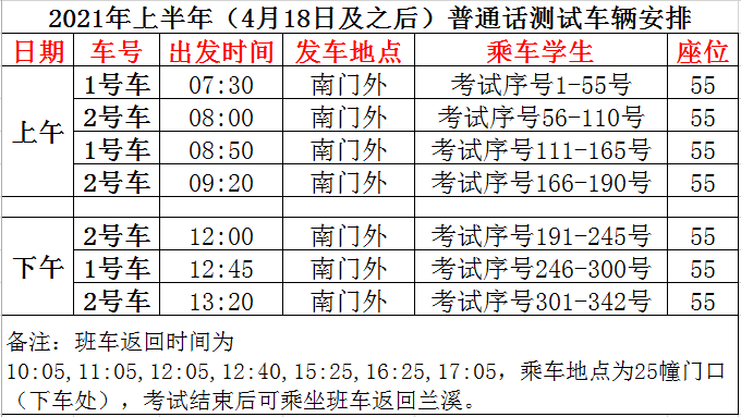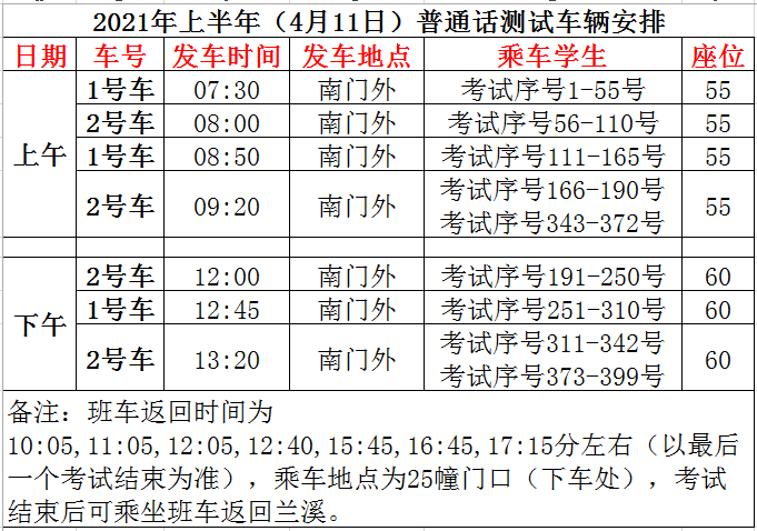 二、因疫情防控两校区学生班车停开,为方便考生,学院安排了往返兰溪校区至师大校园的车辆,供考生自愿乘坐。考生按学院规定履行进出校园手续后,按指定时间在学院南门外上车前往师大校园内(经咨询考点,因疫情防控,非师大本部学生不能自行扫码或持一卡通进出师大校园,望悉知。)