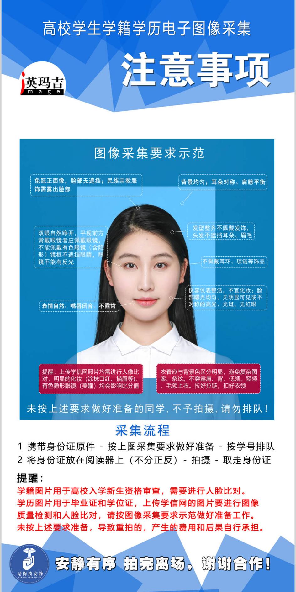 根据《高等教育学历证书电子注册图像采集规范及信息标准》(教毕指〔2017〕99号)文件精神,为进一步做好我院毕业生学历电子注册图像采集及标准化服务工作,经与武汉英玛吉数码信息技术有限公司协商,由该公司承办我院2023届预计毕业生进行电子学历照片采集工作。电子图像信息经学生本人在中国高等教育学生信息网(www.chsi.com.cn)核对确认后作为毕(结)业证书、学位证书电子注册图像,若无故不参加图像采集,将无法顺利毕业。现将有关工作通知如下,请各单位做好相关学生的通知工作: