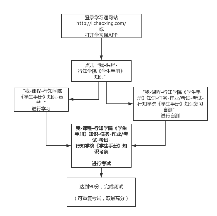 4.《学生手册》知识测试满分100分,其中:单项选择题(50分)、多项选择题(30分)、判断题(20分),测试成绩达到90分方为合格,成绩不合格者请在规定时间内重新测试(在知识考试时间阶段内可以反复测试)。